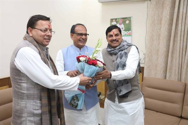 भोपाल : मुख्यमंत्री डॉ. मोहन यादव ने सोमवार की शाम केंद्रीय कृषि एवं ग्रामीण विकास मंत्री श्री शिवराज सिंह चौहान से मुलाकात की। इस अवसर पर उपस्थित उत्तराखंड के मुख्यमंत्री श्री पुष्कर सिंह धामी और मध्यप्रदेश विधान सभा के अध्यक्ष श्री नरेंद्र सिंह तोमर ने भी केंद्रीय मंत्री श्री चौहान से भेंट की। मुख्यमंत्री डॉ. यादव ने सागर में आयोजित कार्यक्रम से लौटने के अवसर पर केंद्रीय मंत्री श्री चौहान से भेंट कर उनका अभिवादन किया। केंद्रीय मंत्री श्री चौहान के पुणे से लौटने पर राजकीय विमान तल पर मुलाकातों का यह संयोग हुआ।
