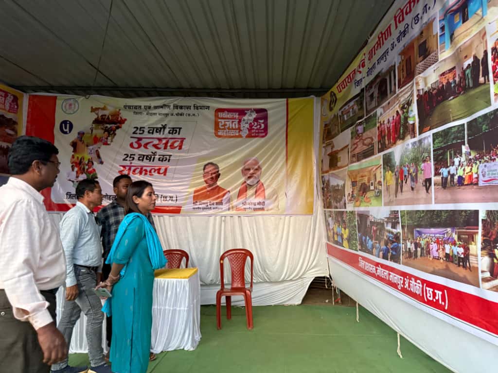 मोहला। पंचायत एवं ग्रामीण विकास विभाग द्वारा रजत जयंती के अवसर पर 13 से 26 अक्टूबर 2025 तक विविध कार्यक्रमों का आयोजन किया जा रहा है। इसी कड़ी में आज जिला मुख्यालय मोहला के दुर्गा चौक में प्रथम दिवस पर विभाग द्वारा गत 25 वर्षों में किए गए विकास कार्यों की जिला स्तरीय छायाचित्र प्रदर्शनी लगाई गई। जिसका अवलोकन जिला पंचायत सीईओ श्रीमती भारती चंद्राकर एवं अपर कलेक्टर श्री जीआर मरकाम ने किया। प्रदर्शनी में विभागीय योजनाओं की झलक प्रस्तुत की गई है, जो एक सप्ताह तक आम जनता के लिए खुली रहेगी। रजत जयंती समारोह के अंतर्गत विशेष ग्राम सभाएं आयोजित होंगी। जिनमें गांव के बीते 25 वर्षों के विकास एवं भविष्य की योजनाओं पर चर्चा की जाएगी। साथ ही प्रधानमंत्री आवास योजना के तहत पात्र हितग्राहियों को स्वीकृति एवं गृहप्रवेश कार्यक्रम आयोजित होंगे।