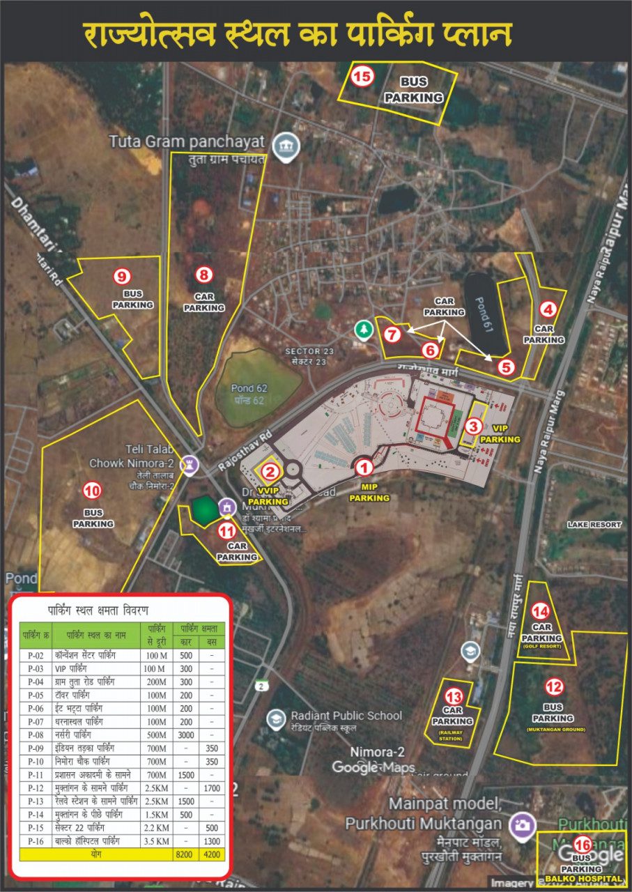 रायपुर प्रधानमंत्री श्री नरेन्द्र मोदी 01 नवम्बर को नवा रायपुर में आयोजित विभिन्न कार्यक्रमों में शामिल होंगे। इस दौरान नागरिकों और व्हीआईपी अतिथियों के सुरक्षित और सुगम आवागमन के लिए यातायात पुलिस रायपुर ने विशेष यातायात व्यवस्था की है। नवा रायपुर में आयोजित कार्यक्रमों में सम्मिलित होने वाले व्हीआईपी एवं नागरिकों के सुरक्षित एवं सुगम आवागमन तथा वाहनों की पार्किंग के लिए मार्ग व पार्किंग स्थल निर्धारित किया गया है। राज्योत्सव स्थल पहुंचने वालों की सुविधानुसार पहुंच मार्गों को 06 रूट में विभाजित किया गया है तथा प्रत्येक रूट में पार्किंग स्थल निर्धारित किया गया है जो निम्नानुसार है-