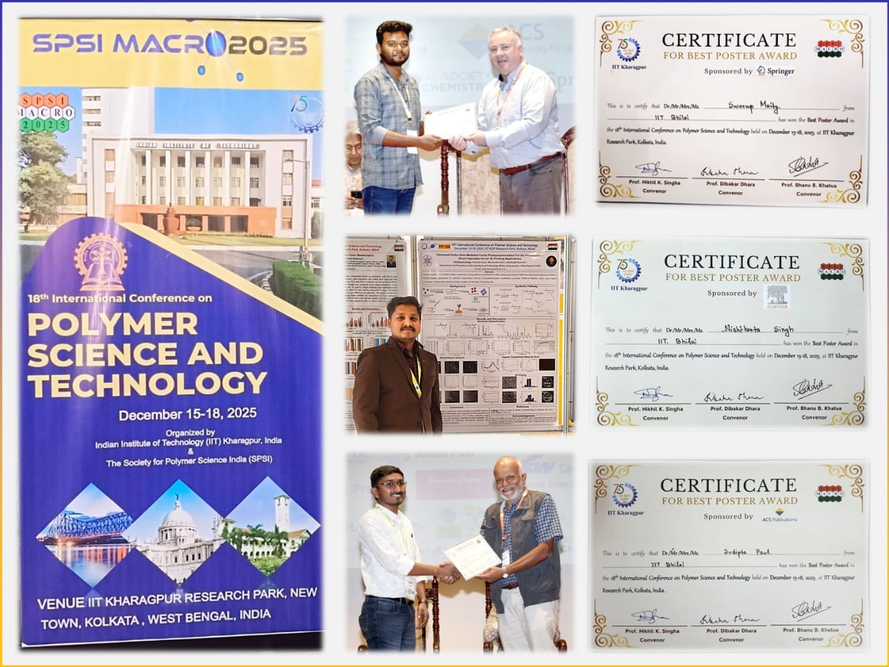 यह प्रतिष्ठित सम्मेलन 15 से 18 दिसंबर 2025 के दौरान भारतीय प्रौद्योगिकी संस्थान खड़गपुर द्वारा आयोजित किया गया था। इस आयोजन में पॉलिमर विज्ञान एवं प्रौद्योगिकी के क्षेत्र में नवीनतम शोध और तकनीकी प्रगति पर चर्चा के लिए विश्वभर से प्रमुख वैज्ञानिकों, शिक्षाविदों और औद्योगिक विशेषज्ञों ने सहभागिता की। आईआईटी भिलाई के रसायन विज्ञान विभाग के तीन शोधार्थियों स्वरूप माईती, निशिकांत, सुदीप्त पॉल को उनके उत्कृष्ट पोस्टर प्रस्तुतियों के लिए यह सम्मान प्रदान किया गया।