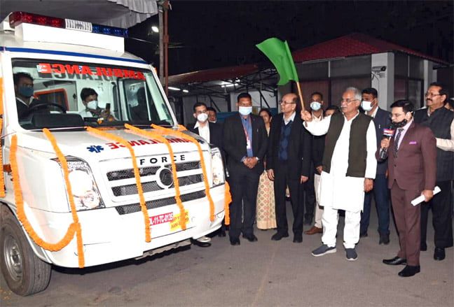 रायपुर । मुख्यमंत्री श्री भूपेश बघेल ने आज शाम राजधानी स्थित अपने निवास कार्यालय परिसर से सभी सुविधाओं एवं उपकरणों से सुसज्जित दो नग एम्बुलेंस को हरी झण्डी दिखाकर रवाना किया। गोयल गु्रप ऑफ इंडस्ट्रीज द्वारा अपने सामाजिक दायित्व निर्वहन के तहत प्रदत्त दोनों एम्बुलेंस में से एक एम्बुलंेस उपाध्याय हॉस्पिटल रायपुर तथा एक एम्बुलेंस उत्तर बस्तर (कांकेर) जिले के अंतर्गत सामुदायिक स्वास्थ्य केन्द्र भानुप्रतापपुर को प्रदाय किए गए हैं। एम्बुलेंस का उपयोग दोनों अस्पतालों द्वारा अपने आसपास के क्षेत्रों में लोगों की सुविधा के लिए किया जाएगा।