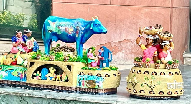 उनके चारों ओर सजे फूलों के गमले गोठानों में साग-सब्जियों और फूलों की खेती के प्रतीक हैं। नीचे के ओर गोबर से बने दीयों की सजावट है। ये दीये ग्रामीण महिलाओं के जीवन में आए स्वावलंबन और आत्मविश्वास के प्रतीक हैं।झांकी के पृष्ठ भाग में गौठानों को रूरल इंडस्ट्रीयल पार्क के रूप में विकसित होते दिखाया गया है।