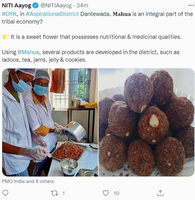 छत्तीसगढ़ के दंतेवाड़ा जिले में महुआ से लड्डू, चाय, जैम, जेली और कुकीज जैसे विभिन्न खाद्य पदार्थ बनाए जा रहे हैं। इस ट्वीट में हाईजीन के मापदंडों के साथ किचन में महुआ के उत्पाद तैयार करती महिलाओं और महुआ लड्डू का चित्र दर्शाया गया है।
