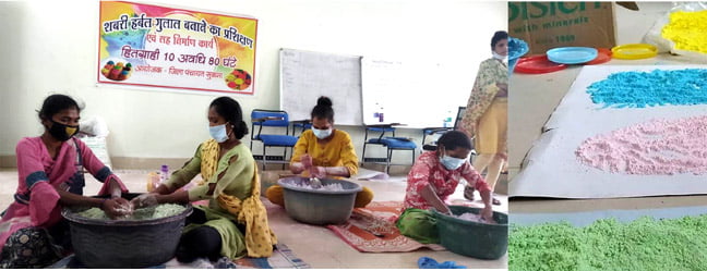 ग्रामीण आजिविका मिशन के जिला कार्यक्रम समन्वयक श्री महेन्द्र चौहान ने बताया कि मुस्कान समूह को पंखुड़ी संस्था के माध्यम से गुलाल बनाने से लेकर विक्रय तक का प्रशिक्षण दिया जा रहा है। वेे लाल, हरा, पीला, नीला और गुलाबी रंगों के 2 क्विंटल गुलाल बना रहीं हैं। गुलाल को स्थानीय बाजार के साथ ही शबरी मार्ट में मात्र 30 रुपए में विक्रय किया जाएगा।