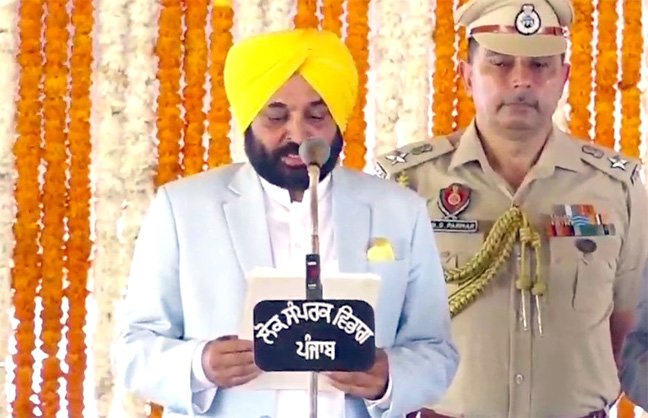बता दें विधानसभा चुनाव में बंपर जीत के साथ पंजाब में आम आदमी पार्टी की सरकार बनी है। पंजाब विधानसभा की 117 सीटों में से 92 सीटों पर आम आदमी पार्टी ने कब्जा किया है। कभी अपनी कॉमेड़ी से लोगों के दिलों पर राज करने वाले भगवंत मान आम आदमी पार्टी के नेतृत्व कर्ता हैं और आज उन्होंने मुख्यमंत्री पद की शपथ ली। इस मौके पर पार्टी के फाउंडर व दिल्ली के सीएम अरविंद केजरीवाल भी उपस्थित रहे।