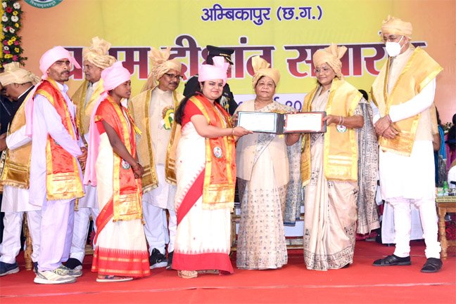छत्तीसगढ़ के संपूर्ण विकास के लिए विष्वविद्यालय को अपनी आकादमिक गतिविधियों से आगे बढकर सामाजिक सरोकारों और स्थानीय आवष्यकताओं से स्वयं को जोड़ते हुए नवाचार को बढावा दें और शिक्षा के माध्यम से अंचल को सुसंस्कृत, सुशिक्षित बनाएं। उन्होंन कहा कि हमारे पूर्व राष्ट्रपति डॉ. ए. पी. जे. अब्दुल कलाम ने विकसित भारत का जो स्वप्न देखा था, वह अच्छी शिक्षा के द्वारा ही संभव होगा। उनके मार्ग पर चलें उनका अनुसरण करें और उनके सपनों को साकार करनें का प्रयास करें। जनजातीय कार्य मंत्रालय के केन्द्रीय राज्य मंत्री श्रीमती रेणुका सिंह दीक्षांत समारोह को संबोधित करते हुए कहा कि षिक्षण संस्थाएं विद्यार्थियों के विकास में अमूल्य योगदान देती हैं। उपाधी धारकों को उन्होंने कहा कि यह आपके जीवन का स्वर्णिम कदम है ,इस षिक्षा और ज्ञान से आप विष्व को चमत्कृत कर सकते हैं। आजादी का यह अमृत वर्ष आपके जीवन का प्रारंभिक वर्ष होने जा रहा है। आपकी आज की षिक्षा ही यह तय करेगी कि 2047 में जब हम आजादी के सौ वर्ष पूरे करेंगे ,तब हम कहा होंगे। आपके आत्मनिर्भर होने से ही देष आत्मनिर्भर होगा। समस्त उपाधि प्राप्त कर्ताओं केा बधाई देते हुए उन्होंने कहा आप निरंतर अपने ज्ञान को बढ़ाएं और देष निर्माण में योगदान दें।