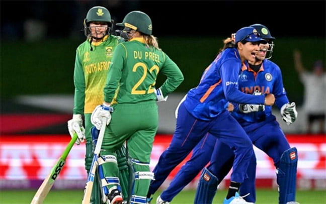 क्राइस्टचर्च । भारतीय महिला क्रिकेट टीम दक्षिण अफ्रीका से आखिरी गेंद तक खिंचे मुकाबले में रविवार को तीन विकेट से हारकर आईसीसी महिला विश्व कप के सेमीफाइनल में जाने से चूक गई। इसी के साथ भारतीय टीम वर्ल्ड कप से भी बाहर हो गई है और वेस्टइंडीज की टीम अंतिम चार में पहुंच गई है। पहले ही सेमीफाइनल में पहुंच चुकी दक्षिण अफ्रीका के सामने जीत के लिए 275 रनों का लक्ष्य था और उसने आखिरी गेंद पर हासिल कर लिया।