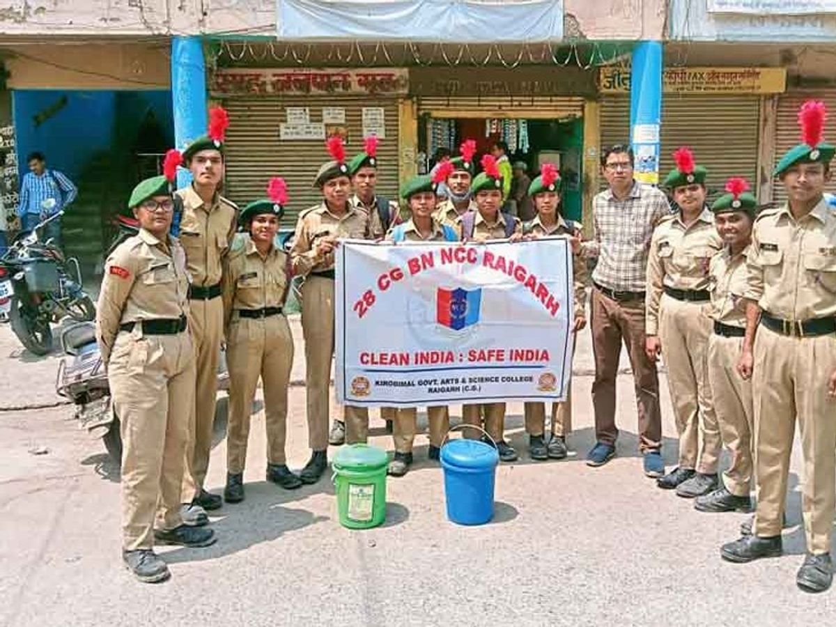 रायगढ़। 28 छत्तीसगढ़ बटालियन एनसीसी रायगढ़ के कर्नल विनय मल्होत्रा एवं लेफ्टिनेंट कर्नल संतोष रावत के कुशल निर्देशन एवं जिले के अग्रणी महाविद्यालय किरोड़ीमल शासकीय कला एवं विज्ञान महाविद्यालय रायगढ़ के प्राचार्य डॉ. अंजनी तिवारी के मार्गदर्शन में लेफ्टिनेंट डॉक्टर शारदा घोघरे द्वारा एनसीसी के कैडेट्स के सहयोग से शहर के विभिन्न चौक-चौराहों एवं वार्डों में स्वच्छता का संदेश प्रसारित किया गया। इस कार्यक्रम की शुरुआत 2 अप्रैल से शुरू की गई थी और यह कार्यक्रम लगातार 16 अप्रैल तक चलता रहा।