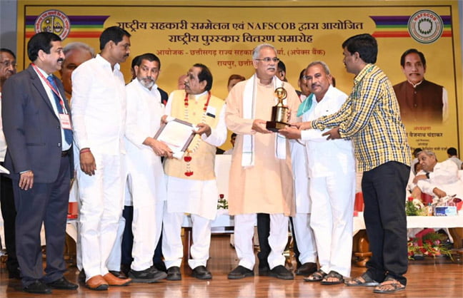 रायपुर । मुख्यमंत्री श्री भूपेश बघेल ने आज राजधानी रायपुर स्थित पंडित दीनदयाल उपाध्याय ऑडिटोरियम में आयोजित राष्ट्रीय सहकारी सम्मेलन और राष्ट्रीय पुरस्कार वितरण समारोह में सहकारिता के क्षेत्र में उत्कृष्ट कार्य करने वाले सहकारी संस्थाओं को पुरस्कृत किया।    मुख्यमंत्री श्री भूपेश बघेल ने स्टेट कोआपरेटिव बैंक केटेगरी में ओवर ऑल परफोर्मेंस के लिए तमिलनाडु स्टेट अपेक्स कोऑपरेटिव बैंक चेन्नई को प्रथम, आंध्रप्रदेश स्टेट कोऑपरेटिव बैंक विजयवाड़ा को द्वितीय और तेलंगाना स्टेट अपेक्स कोऑपरेटिव बैंक हैदराबाद को तृतीय पुरस्कार प्रदान किया गया।