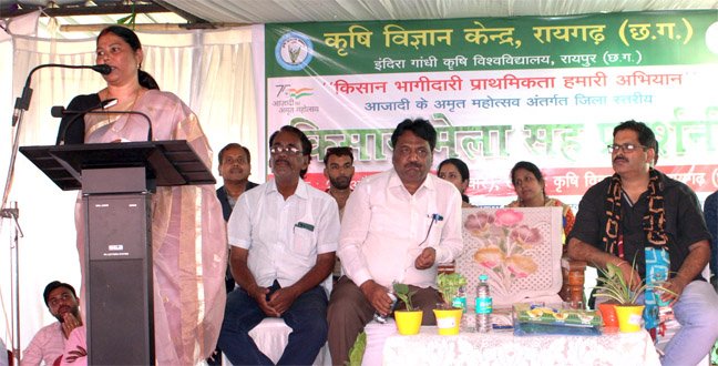 रायगढ़ । आजादी के अमृत महोत्सव के अंतर्गत सांसद श्रीमती गोमती साय के मुख्य आतिथ्य में कृषि विज्ञान केन्द्र रायगढ़ परिसर में प्राकृतिक खेती पर आधारित एक दिवसीय किसान मेला एवं कृषि प्रदर्शनी कार्यक्रम का आयोजन किया गया। सांसद श्रीमती साय ने कृषि विज्ञान केन्द्र प्रांगण में उन्नत किसानों द्वारा लगाये गए उत्कृष्ट कृषि उत्पादों की प्रदर्शनी का उद्घाटन करते हुए कृषकों की प्रशंसा की। कृषि विज्ञान केन्द्र रायगढ़ परिसर में कृषि विज्ञान केन्द्र रायगढ़, उप-संचालक (आत्मा परियोजना) एवं उद्यानिकी विभाग रायगढ़ के संयुक्त तत्वधान में आयोजित कार्यक्रम में 300 से अधिक किसान उपस्थित रहे। श्रीमती साय ने कृषकों को मार्गदर्शन देते हुए कहा की किसान ही धरती का असली अन्नदाता है एवं उसी के मेहनत से हम सब फल फुल रहे है। देश के प्रधानमंत्री किसानों के हित में अनेक योजनायें ला रहे है जिससे देश की अर्थव्यवस्था मजबूत हो रही है। उन्होंने कहा की किसानों को कृषि विज्ञान केन्द्र में वैज्ञानिकों के द्वारा प्रशिक्षण, प्रयोग एवं अनुसंधान कार्यो के परिणामों के अनुसार ही खेती करनी चाहिये एवं वैज्ञानिक के दिशा-निर्देश में कृषि तकनीकोंं को अपनाना चाहिए। उन्होंने रायगढ़ के वैज्ञानिकों की तारीफ करते हुए कहा की किसानों की आमदनी बढऩे में कृषि वैज्ञानिकों की अहम भूमिका है।