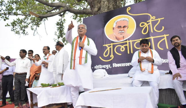 रायपुर । मुख्यमंत्री भूपेश बघेल भेंट-मुलाकात कार्यक्रम के तहत प्रतापपुर विधानसभा क्षेत्र के ग्राम गोविंदपुर पहुंचे। मुख्यमंत्री ने गोविंदपुर में क्षेत्र के विकास के लिए अनेक महत्वपूर्ण घोषणाएं की। उन्होंने माता राजमोहिनी समाधि स्थल परिसर में गेट निर्माण, सौंदर्यीकरण और अहाता निर्माण के लिए 50 लाख रुपए देने की घोषणा। इसी प्रकार झरिया ज्वाला देवी मंदिर का सौंदर्यीकरण, 33/11 केवी सबस्टेशन की स्थापना की घोषणा की। विद्युत उप केन्द्र की स्थापना से आप-पास के 95 गांवों को फायदा होगा। मुख्यमंत्री ने हाथी की समस्या से निपटने के लिए इस क्षेत्र के 11 गांवों में 33 जगहों पर सोलर लाइट लगाने, गोविंदपुर में जिला सहकारी केंद्रीय बैंक की शाखा खोलने, 11 नंबर चौकी से रमकोटा मार्ग निर्माण की घोषणा की। ग्रामीणों की शिकायत पर मुख्यमंत्री ने गोविंदपुर में आवर्ती चराई गौठान निर्माण में लापरवाही बरतने वाले अधिकारियों के निलंबन की कार्यवाही की घोषणा भी की। नगरीय प्रशासन एवं विकास मंत्री डॉ. शिवकुमार डहरिया और स्कूल शिक्षा मंत्री डॉ. प्रेमसाय सिंह टेकाम भी इस अवसर पर उपस्थित थे। मुख्यमंत्री ने गोविंदपुर की आंगनबाड़ी का निरीक्षण भी किया।
