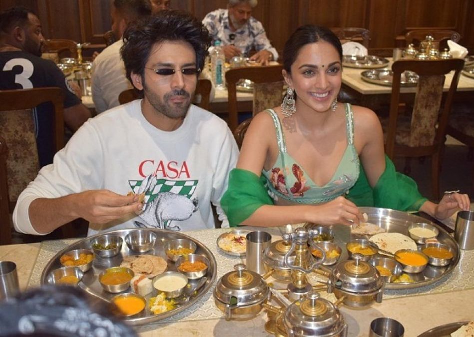 अभिनेता कार्तिक आर्यन और एक्ट्रेस कियारा आडवाणी जल्द ही अपने फैंस के लिए भूल भुलैया 2 मूवी लेकर आ चुके है। मूवी 20 मई को सिनेमाघरों में दस्तक देने वाली है। इन दिनों दोनों स्टार मूवी की जमकर प्रमोशन करने में जुटे हुए हैं और इसी सिलसिले वो हाल ही में गुजरात के अहमदाबाद पहुंचे, जहां दोनों स्टार्स ने एक साथ गुजराती थाली का भी लूट उठाते हुए नजऱ आए। कार्तिक-कियारा की ये फोटोज अब सोशल मीडिया पर खूब वायरल होने लगी है।