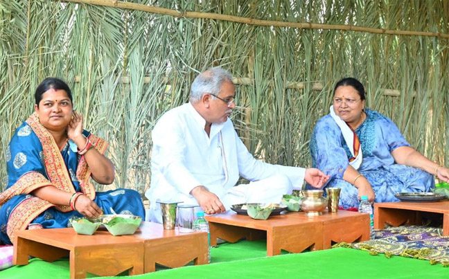 रायपुर । मुख्यमंत्री भूपेश बघेल अपने भानुप्रतापपुर विधानसभा प्रवास के दौरान दुर्गूकोंदल में महिला किसान श्रीमती सविता उईके के घर पहुँचे। उन्होंने श्रीमती सविता के घर जमीन पर बैठ कर भोजन किया। सविता उईके ने मुख्यमंत्री को करमत्ता भाजी, कोलियारी भाजी, चेंच भाजी, रखिया बड़ी एवं आलू की सब्जी, जिमी कंद की सब्जी, उड़द-मूंग दाल, चांवल, रोटी, जिर्रा फूल की चटनी, आम चटनी एवं मड़िया पेज परोसा। इसके बाद खीर, छिन्द, जामुन और देशी आम का भी मुख्यमंत्री ने स्वाद लिया।