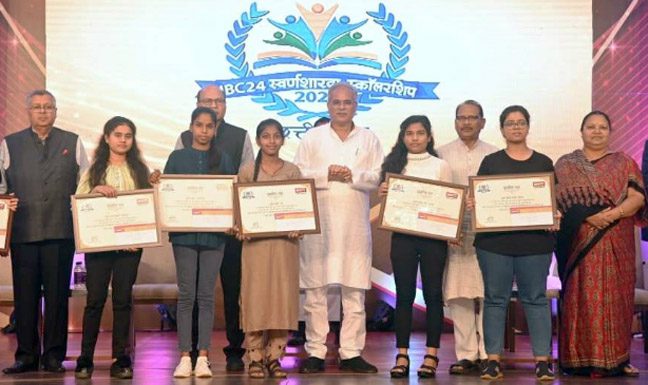 रायपुर । मुख्यमंत्री श्री भूपेश बघेल आज शाम आईबीसी-24 द्वारा राजधानी रायपुर के एक निजी होटल में आयोजित स्वर्णशारदा स्कॉलरशिप 2022 वितरण कार्यक्रम में प्रतिभावान छात्राओं को सम्मानित किए। स्वर्णशारदा स्कॉलरशिप के तहत राज्य की प्रावीण्य सूची में स्थान बनाने वाले छात्र-छात्राओं को छात्रवृत्ति प्रदान की जा रही है। मुख्यमंत्री श्री बघेल ने इस दौरान प्रदेश के छात्र-छात्राओं को शिक्षा के लिए प्रोत्साहित करने आईबीसी-24 संस्थान द्वारा की जा रही पहल की सराहना की।
