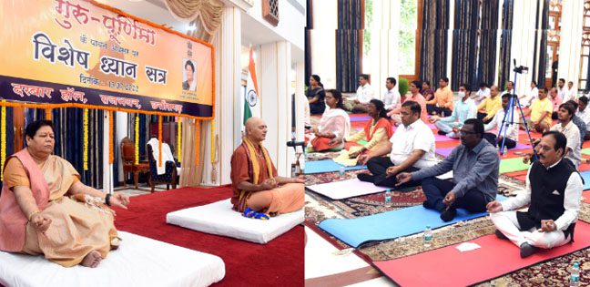 रायपुर । ध्यान और योग हमारी प्राचीन संस्कृति की देन है। मेडिटेशन से मानसिक तनाव से मुक्ति मिलती है। साथ ही दृष्टिकोण सकारात्मक होता है। मेडिटेशन वह माध्यम है जिससे हम आंतरिक ऊर्जा को जागृत कर सकते हैं। यह बात राज्यपाल ने कही। राज्यपाल राजभवन के दरबार हॉल में गुरू पूर्णिमा के अवसर पर आयोजित विशेष ध्यान सत्र को सम्बोधित कर रही थी। गौरतलब है कि राजभवन सचिवालय के अधिकारी-कर्मचारियों के लिए आज राजभवन में विशेष ध्यान सत्र का आयोजन किया गया था। राज्यपाल सुश्री अनुसुईया उइके ने कहा कि प्राचीन समय में हमारे ऋषि मुनि अपनी आत्मिक शक्ति को जागृत करने के लिए ध्यान योग किया करते थे। उन्होंने कहा कि आधुनिक भाग-दौड़ भरी जिंदगी से हम कई तरह के मानसिक तनाव के दौर से गुजर रहे हैं। इससे अनेक बीमारियों की गिरफ्त में हम आ रहे हैं।