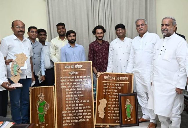 मुख्यमंत्री को श्री तारकेश्वर वर्मा ने काष्ठ पर उकेरी गई छत्तीसगढ़ महतारी की मूर्ति, छत्तीसगढ़ सरकार का मोनो, भारत के संविधान की उद्देशिका, डॉ. नरेंद्र देव वर्मा द्वारा रचित छत्तीसगढ़ राजगीत भेंट किया। मुख्यमंत्री ने शिल्पकार श्री वर्मा के काष्ठ शिल्प की सराहना की और उन्हें धन्यवाद दिया। इस अवसर पर श्री भोला वर्मा सहित अन्य लोग भी उपस्थित थे।