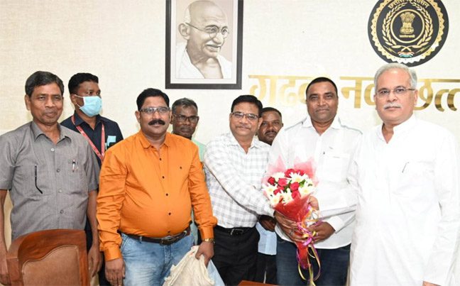 रायपुर । मुख्यमंत्री श्री भूपेश बघेल से यहां उनके निवास कार्यालय में कन्नौजिया कुर्मी समाज के प्रतिनिधि मंडल ने सौजन्य मुलाकात की। मुख्यमंत्री को प्रतिनिधि मंडल ने जांजगीर-चांपा जिले के नगर पंचायत शिवरीनारायण में समाज के नवनिर्मित धर्मशाला के उद्घाटन कार्यक्रम में शामिल होने के लिए न्यौता दिया।