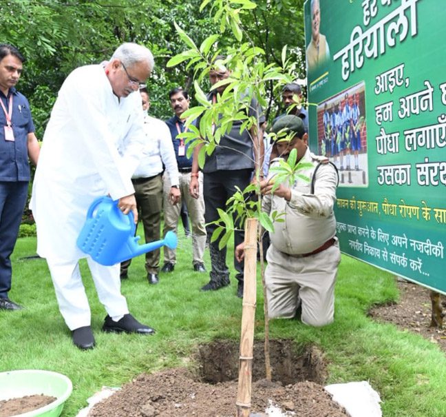 रायपुर । मुख्यमंत्री भूपेश बघेल ने आज प्रथम सावन सोमवार को यहां अपने निवास में ’हर घर हरियाली’ अभियान के तहत रुद्राक्ष का पौधा लगाया। इस अवसर पर संस्कृति मंत्री श्री अमरजीत भगत भी उपस्थित थे। इस अवसर संस्कृति मंत्री श्री अमरजीत भगत, रायपुर कलेक्टर श्री सर्वेश्वर भूरे, डीएफओ विश्वेश्वर रॉय उपस्थित थे।