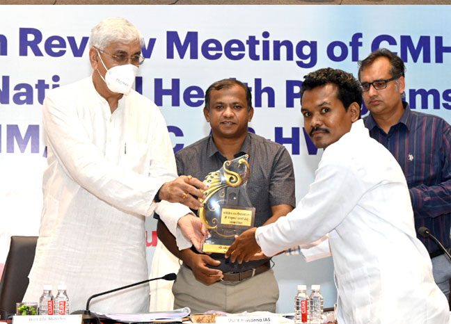 स्वास्थ्य मंत्री ने बैठक में कोविड वैक्सीनेशन में उल्लेखनीय योगदान के लिए बीजापुर जिले के उसूर सामुदायिक स्वास्थ्य केंद्र के तीन स्वास्थ्य अधिकारी (त्भ्व्) श्रीमती ज्योति सिदार, श्रीमती नागमणी चिलमुल और श्री रमेश गड्डेम को प्रशस्ति पत्र एवं शाल भेंट कर सम्मानित किया। इन तीनों स्वास्थ्य योद्धाओं ने कोविड वैक्सीनेशन के लिए घुटने तक पानी से भरे तीन नदियों को पैदल पार कर ग्राम मारूड़बाका पहुंच लोगों का वैक्सीनेशन किया था।