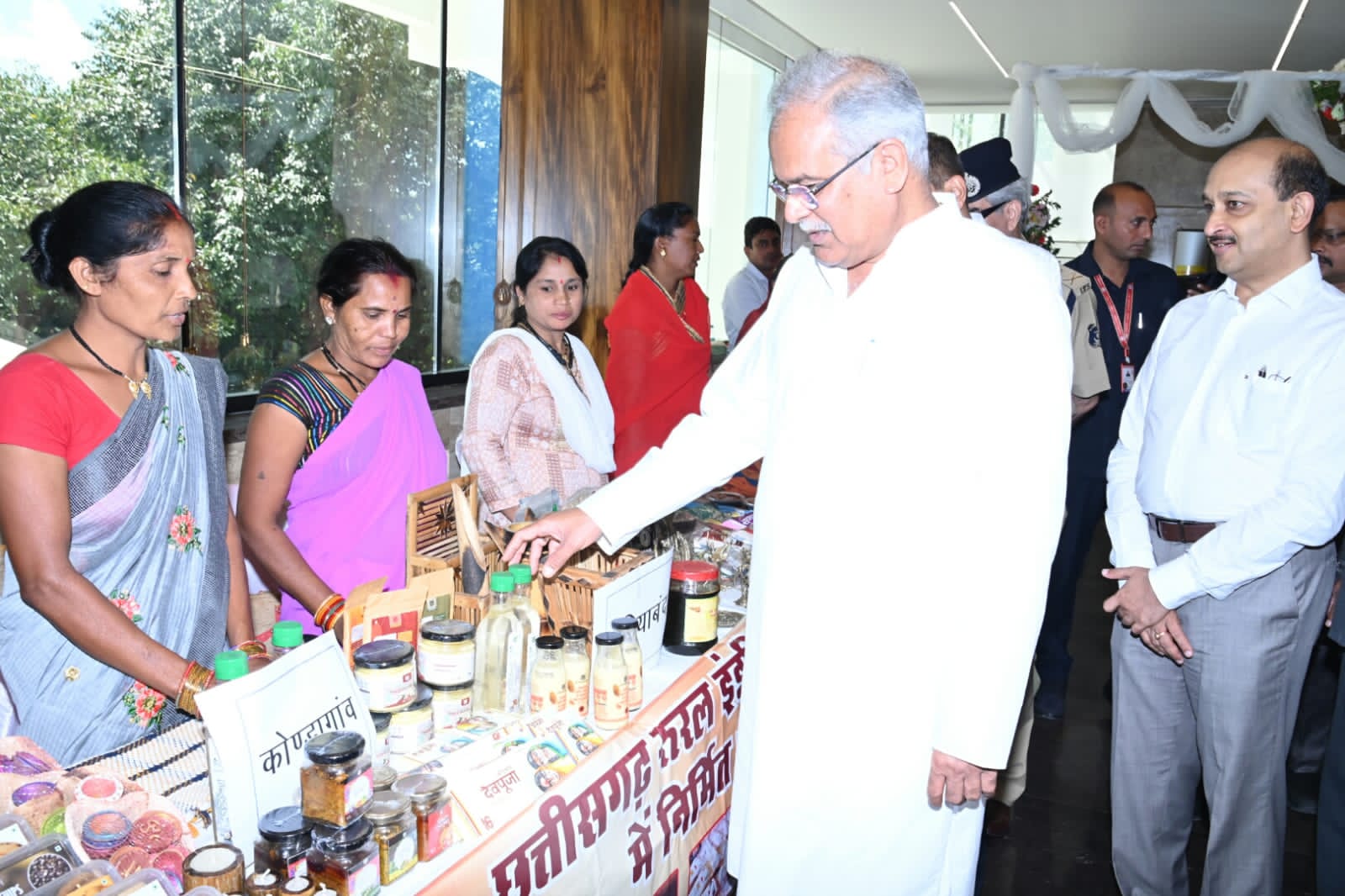 गौरतलब है कि मुख्यमंत्री श्री भूपेश बघेल आज राजधानी कि न्यू सर्किट हाऊस में कलेक्टर एसपी कान्फ्रेस के दौरान वाहन   गौरतलब है कि मुख्यमंत्री श्री भूपेश बघेल आज राजधानी कि न्यू सर्किट हाऊस में कलेक्टर एसपी कान्फ्रेस के दौरान वाहन गौठान एवं रीपा रूरल इंण्डस्ट्रीयल पार्क के स्वयं स्वः सहायता समूह के द्वारा लगाए स्टॉल का अवलोकन करने पहुंचे। वहाँ उन्होंने समूह द्वारा प्रदर्शित उत्पाद गोबर से बने पेंट कुकीस, अचार तथा बाँस से बने घरेलू उपयोग की वस्तुएं कलाकृति को देखा तथा इस संबंध में जानकारी ली। मुख्यमंत्री ने महिलाओं द्वारा निर्मित किये गए उत्पादों की सराहना करते हुए अपर मुख्य सचिव को कहा कि, राज्य की सभी शासकीय स्कूलों में पोताई कार्य में गौठान या रूरल इंण्डस्ट्रीयल पार्क में निर्मित गोबर से बने पेंट का उपयोग करने के निर्देश जारी करें।
