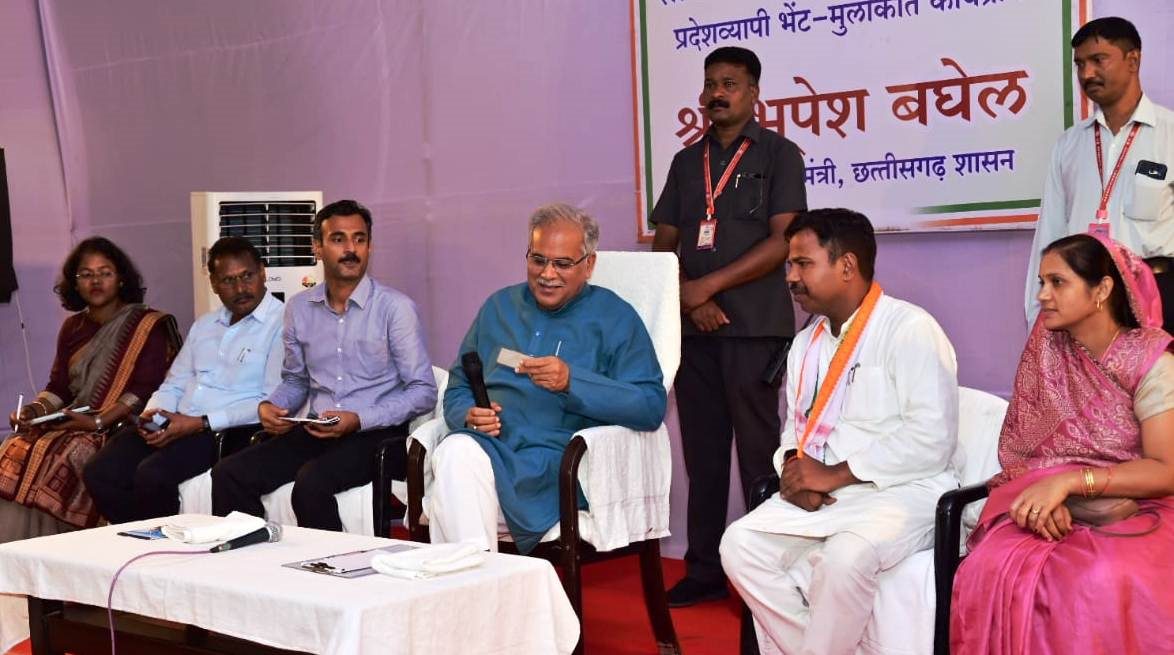 रायपुर  मुख्यमंत्री  भूपेश बघेल ने आज भेेंट-मुलाकात कार्यक्रम के दौरान आज नवगठित जिला सक्ती के चन्द्रपुर विश्राम में विभिन्न समाजों के प्रमुख और सामाजिक संगठनों के प्रतिनिधियों से मुलाकातकर सामाजिक गतिविधियों और उनकी समस्याओं के बारे में चर्चा की। स्वर्गीय मुकुटधर पाण्डेय स्मृति समिति की मांग पर मुख्यमंत्री ने चन्द्रपुर के कॉलेज का नामकरण मुकुटधर पाण्डेय के नाम पर करने की बात कही और पुस्तकालय की मांग पर सहमति जताते हुए डभरा में सब्जी मंडी खोलने की घोषणा की। उन्होंने मुख्यमंत्री श्री भूपेश बघेल का पूर्व महामहिम राष्ट्रपति से सम्मानित श्री नीलांबर देवांगन ने कोसा से बना जैकेट पहनाकर अभिनंदन किया।