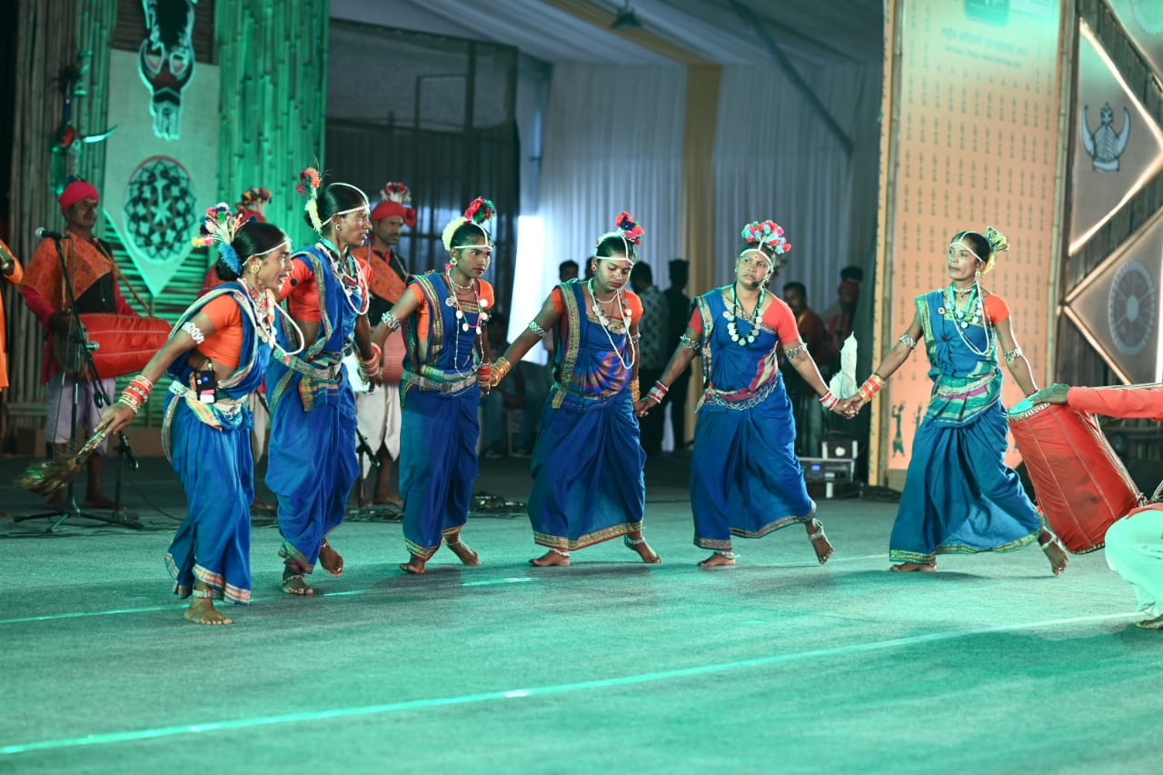 रायपुर । महिलायें गहरी नीली साड़ी पहने और सिर में कलगी लगाए आदिवासी परम्परा की पहचान को सरंक्षित रखते हुए। सामूहिक, सामजंस्य और एकता का संदेश देते हुए।