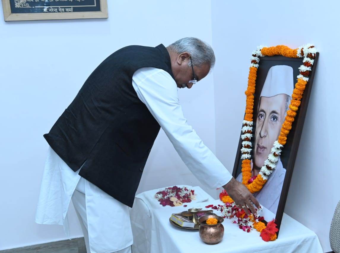 रायपुर । मुख्यमंत्री श्री भूपेश बघेल ने आज यहां अपने निवास कार्यालय में भारत के प्रथम प्रधानमंत्री भारत रत्न पंडित जवाहर लाल नेहरू की जयंती पर उनके छायाचित्र पर पुष्प अर्पित कर उन्हें नमन किया । उन्होंने बाल दिवस पर सभी बच्चों सहित प्रदेशवासियों को बधाई देते हुए कहा कि पंडित नेहरू को बच्चे बहुत प्रिय थे, बच्चे भी उन्हें प्यार से चाचा नेहरू कहते थे। इसी स्नेह और प्रेम के कारण पंडित नेहरू का जन्मदिन बाल दिवस के रूप में मनाया जाता है। खैरागढ़ विधायक श्रीमती यशोदा वर्मा भी इस अवसर पर उपस्थित थीं।