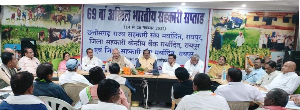 जिसका परिणाम है कि गोबर एवं गोमूत्र खरीदी कर सहकारिता के माध्यम से किसानों के खेतों तक जैविक उत्पाद उपलब्ध कराने का काम हो रहा है। जिला सहकारी केंद्रीय बैंक रायपुर के सभागार में आयोजित कार्यक्रम में प्रदेश भर से आए सहकारीजनों की उपस्थिति में सहकारिता आन्दोलन को गति देने तथा सहकारिता को और मजबूत करने के उपायों पर चर्चा हुई। कार्यक्रम की अध्यक्षता जिला सहकारी केंद्रीय बैंक रायपुर के अध्यक्ष श्री पंकज शर्मा ने की। अति विशिष्ट अतिथि के रूप में छत्तीसगढ़ राज्य कृषक कल्याण परिषद अध्यक्ष श्री सुरेंद्र शर्मा, विशिष्ट अतिथियों में राज्य सहकारी संघ उपाध्यक्ष रविन्द्र सिंह भाटिया, जिला पंचायत रायपुर की पूर्व अध्यक्ष श्रीमती शारदा वर्मा, राज्य संघ विशेषज्ञ संचालक हरिश तिवारी, मानसेवी संचालक अश्विनी बबलू त्रिवेन्द्र एवं श्रीमती शोभा चाहिल उपस्थित थे।