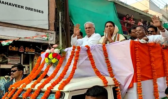 महिलाएं नारे लगाते चल रही थीं। कांग्रेस समर्थक युवाओं तथा युवक कांग्रेस के पदाधिकारी – कार्यकर्ताओं ने विशाल बाईक रैली निकालकर नगर भ्रमण किया। युवाओं का झुंड मनोज भैया जिंदाबाद, कांग्रेस पार्टी जिंदाबाद के नारे लगाते आगे बढ़ता रहा। जैसे ही मुख्यमंत्री भूपेश बघेल चारामा पहुंचे पार्टी कार्यकर्ताओं और कांग्रेस के लोगों का उत्साह दुगुना हो गया। श्री बघेल ने खुले पिक अप वाहन पर सवार होकर रोड शो शुरू किया। इस वाहन पर भूपेश बघेल के साथ पीसीसी चीफ मोहन मरकाम, मंत्री कवासी लखमा, अन्य मंत्री, कांग्रेस प्रत्याशी सावित्री मंडावी आदि सवार थे। पिक अप वाहन के आगे आगे सैकड़ों बाईक पर सवार युवा नारे लगाते हुए तथा लोक कलाकारों का दल मांदरी नृत्य करते चल रहे थे। आंगादेव की झांकी अलग छटा बिखेर रही थी।