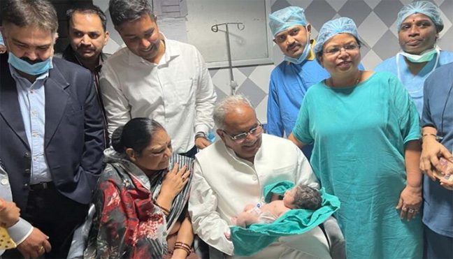 भिलाई। मुख्यमंत्री भूपेश बघेल आज दादा बन गए हैं। सीएम भूपेश बघेल के पुत्र चैतन्य बघेल व पुत्रवधु ख्याति बघेल ने पुत्र रत्न को जन्म दिया है। पोते के जन्म की सूचना मिलते ही मुख्यमंत्री भूपेश बघेल खुद को रोक नहीं पाए और भिलाई के बीएम शाह हॉस्पिटल पहुंच गए जहां उनकी बहू ने बेटे को जन्म दिया। सीएम बघेल के अस्पताल पहुंचते ही कांग्रेस कार्यकर्ताओं का मजमा लगा रहा और हर कोई उन्हें पोते की बधाई दे रहा है।
