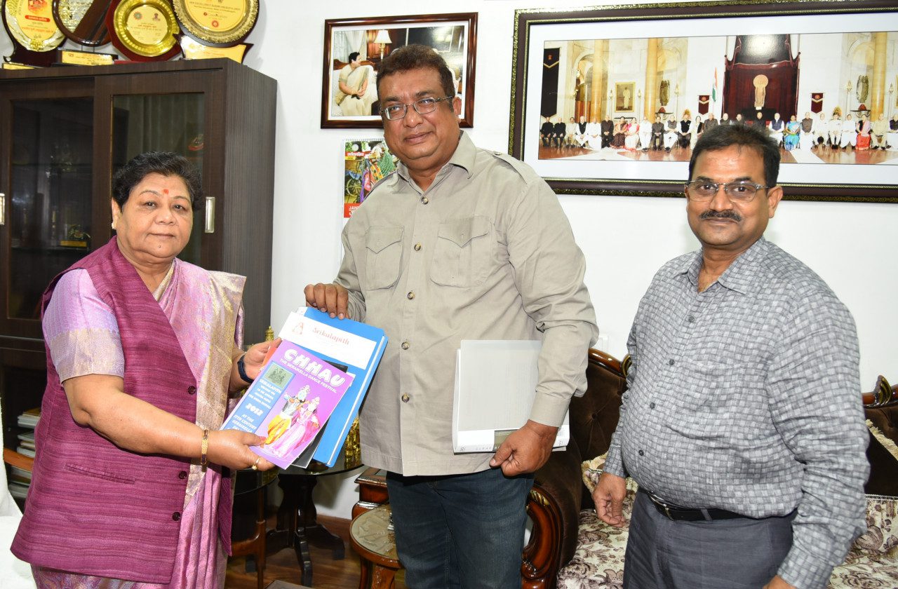 रायपुर । राज्यपाल सुश्री अनुसुईया उइके से आज राजभवन में श्रीकलापीठ सरायकेला, झारखण्ड के संरक्षक श्री प्रताप आदित्य सिंह देव ने सौजन्य भेंट की। श्री सिंहदेव ने राज्यपाल को सरायकेला में 11 से 13 अप्रैल 2023 तक आयोजित होने वाले चैत्र पर्व के अवसर पर मुख्य अतिथि के रूप में शामिल होने का आमंत्रण दिया। राज्यपाल को श्री सिंह ने चैत्र पर्व तथा श्रीकलापीठ द्वारा सरायकेला छऊ नृत्य के संरक्षण और इसके प्रशिक्षण के लिए किये जा रहे प्रयासों से अवगत कराया।