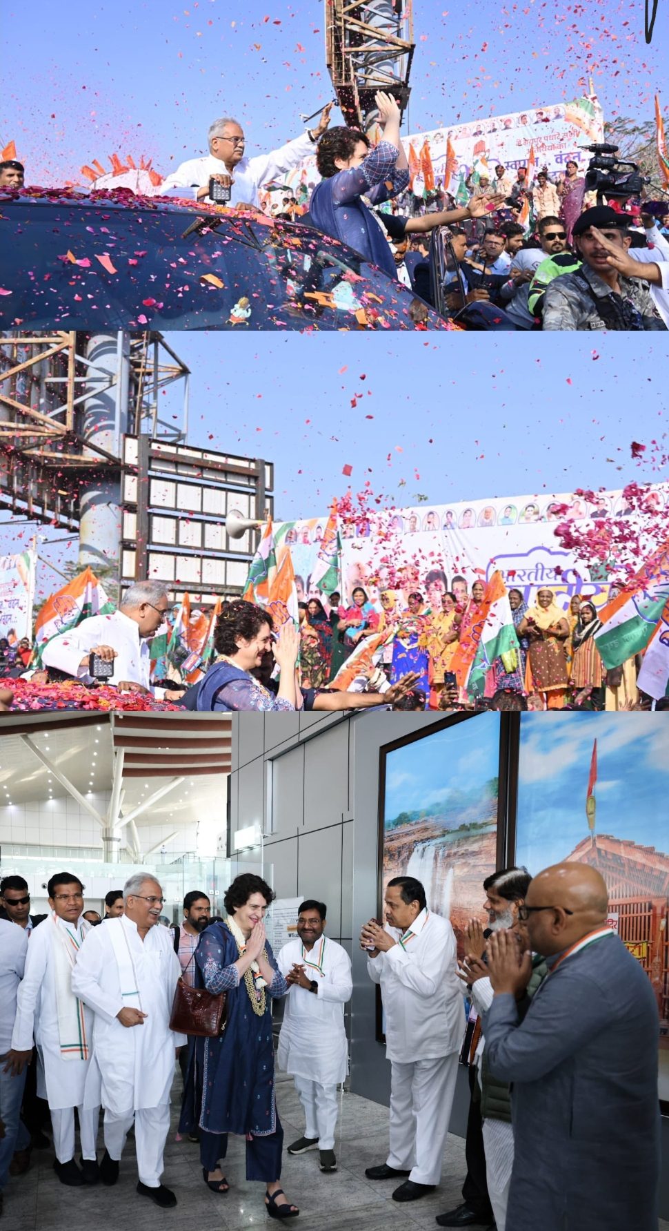 रायपुर। छत्तीसगढ़ की राजधानी रायपुर में कांग्रेस का 85वां अधिवेशन 24 फरवरी से शुरू हो चुका है और आज कांग्रेस का 85वां अधिवेशन का दूसरा दिन है। इस मौके पर आज प्रियंका गांधी राजधानी रायपुर पहुंच चुकी है। उनके स्वागत के लिए नया रायपुर स्थित एयरपोर्ट से कई किमी की सड़कों पर गुलाब के फुल सजाए गए हैं। वहीं सेवा दल के लोग सेक्यूरिटी में लगे हुए हैं। आपको बता दें कि आज कांग्रेस राष्ट्रीय अधिवेशन का दूसरा दिन है और आज का दिन बहुत ही महत्वपूर्ण है। वहीं कांग्रेस राष्ट्रीय अधिवेशन में सुरक्षा व्यवस्था भी काफी मुस्तैद रखी गई है।