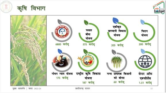वर्ष 2023-24 के बजट में कृषि एवं संबंध क्षेत्रों के लिए 23 हजार 215 करोड़ रूपए का बजट का प्रावधान किया गया है। यह कुल बजट का 19.11 प्रतिशत है। इसमें पिछले चार वर्षों में लगातार कृषि क्षेत्र में राजीव गांधी किसान न्याय योजना के अंतर्गत किसानों को आदान सहायता प्रदान करने के लिए 6 हजार 800 करोड़ की राशि का प्रावधान है, जिससे 26 लाख 41 हजार किसानों को सीधा फायदा पहुंचेगा।