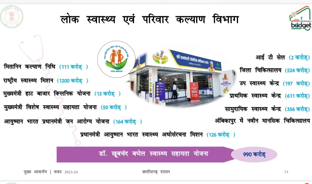 प्रदेशवासियों को निःशुल्क स्वास्थ्य सुविधाएं मुहैया कराने स्वास्थ्य एवं चिकित्सा शिक्षा मंत्री श्री टी.एस. सिंहदेव की पहल को मूर्त रूप देने अगले वर्ष के बजट में डॉ. खूबचंद बघेल स्वास्थ्य सहायता योजना के लिए 900 करोड़ रूपए और मुख्यमंत्री स्वास्थ्य सहायता योजना के लिए 50 करोड़ रूपए का प्रावधान है। ग्रामीण क्षेत्रों में अस्पतालों के उन्नयन और नए अस्पताल खोलने के लिए 1500 नए पद सृजित किए जाएंगे। इनमें बालोद जिले के दल्लीराजहरा और सारंगढ़ में सौ-सौ बिस्तरों के नए अस्पताल के लिए 246 नए पद और धरमजयगढ़ सिविल अस्पताल तथा चिरमिरी, कुसमी, वाड्रफनगर एवं सीतापुर के सामुदायिक स्वास्थ्य केन्द्रों को 100-100 बिस्तर के अस्पताल में उन्नयन के लिए 470 नए पदों का सृजन भी शामिल हैं।