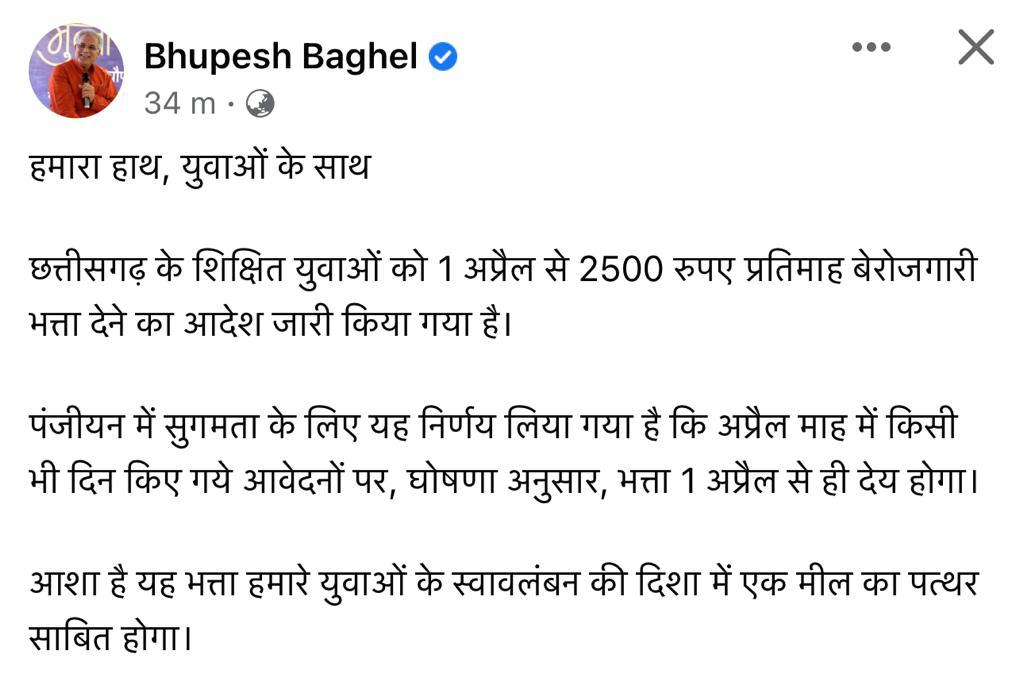 बेरोजगारी भत्ते पर CM भूपेश बघेल बोले- आवेदन अप्रैल में किसी भी तारीख को, अप्रैल से ही मिलेगा बेरोजगारों को 2500 रुपए भत्ता