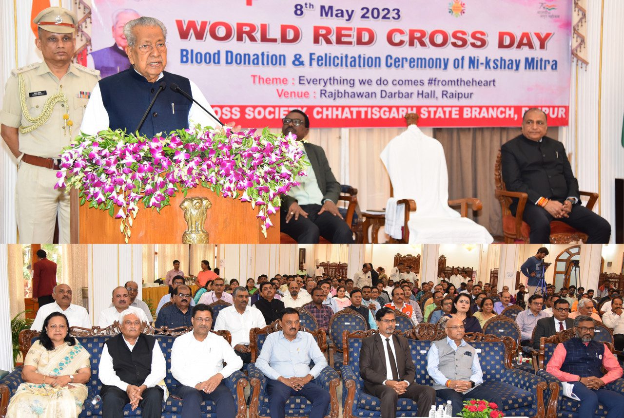 रायपुर राजभवन में आज राज्यपाल श्री विश्वभूषण हरिचंदन की अध्यक्षता में विश्व रेडक्रॉस दिवस के अवसर पर कार्यक्रम आयोजित किया गया। कार्यक्रम में प्रधानमंत्री टी.बी. मुक्त भारत अभियान के तहत सक्रिय रूप से कार्य करने वाले नि-क्षय मित्रों एवं जिलों के जिलाधीशों को सम्मानित किया गया। इस अवसर पर रक्तदान शिविर भी आयोजित की गई। साथ ही रेडक्रॉस सोसायटी छत्तीसगढ़ की वेबसाइट का लोकार्पण भी किया गया। इस अवसर पर राज्यपाल श्री हरिचंदन ने कहा कि रेडक्रॉस सोसायटी द्वारा मानवता की सेवा का महत्वपूर्ण कार्य किया जा रहा है। उन्होंने कहा कि रेडक्रॉस के स्वयं सेवक युद्ध, महामारी या प्राकृतिक आपदा की स्थिति में बिना किसी भेद-भाव के सभी की सेवा करता है।