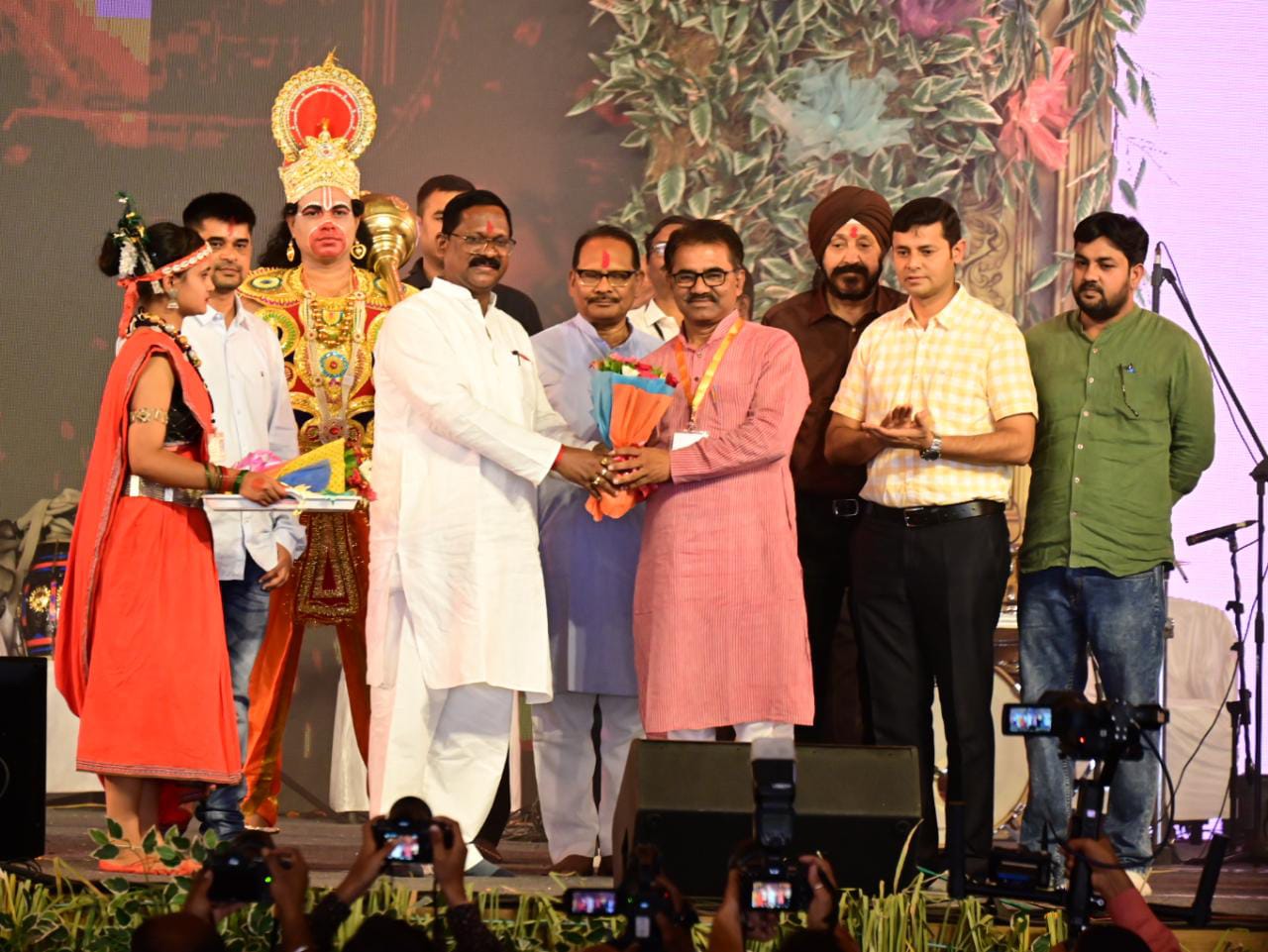 संस्कृति मंत्री श्री अमरजीत भगत एवं स्कूल मंत्री डॉ. प्रेमसाय सिंह टेकाम का मंच पर पहुंचने पर गुलदस्ता भेंट कर स्वागत किया गया।
