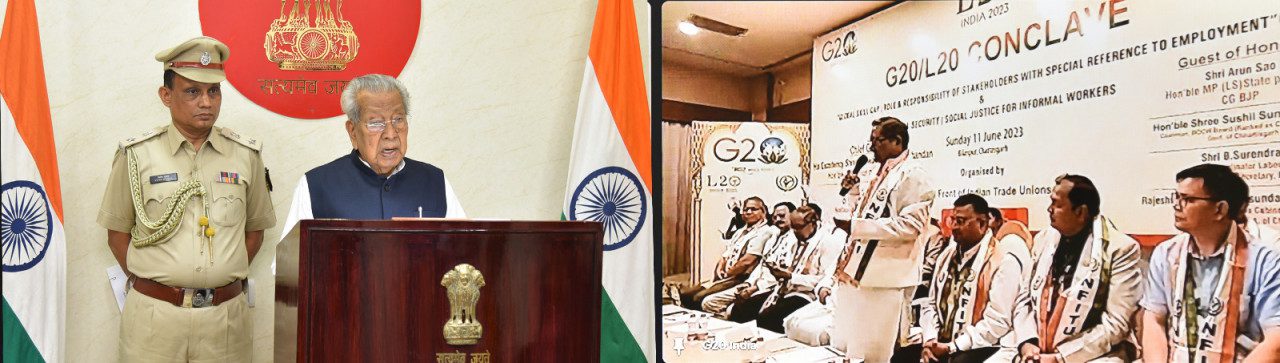 रायपुर राज्यपाल श्री विश्वभूषण हरिचंदन आज बिलासपुर मंे आयोजित जी-20 लेबर 20 कॉन्क्लेव में मुख्य अतिथि के रूप में वर्चुअल तरीके से शामिल हुए। यह कार्यक्रम भारतीय मजदूर संघ (बीएमएस) के सहयोग से नेशनल फ्रंट ऑफ इंडियन ट्रेड यूनियन (एनएफआईटीयू) द्वारा आयोजित किया गया। इस अवसर पर राज्य गौ सेवा आयोग के अध्यक्ष श्री महंत रामसुंदर दास, छत्तीसगढ़ राज्य भवन एवं अन्य सन्ननिर्माण मंडल के अध्यक्ष श्री सन्नी अग्रवाल उपस्थित थे।