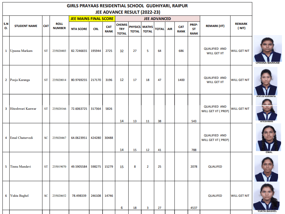 रायपुर जे.ई.ई. एडवांस 2023 की परीक्षा परिणाम घोषित कर दिये गये हैं। प्रदेश में आदिम जाति तथा अनुसूचित जाति विकास विभाग अंतर्गत संचालित प्रयास आवासीय विद्यालय के बच्चों ने उत्कृष्ट प्रदर्शन किया है। आईआईटी गुवाहाटी द्वारा जेईई एडवांस 2023 के घोषित परिणामों में इस वर्ष जेईई एडवांस परीक्षा में बैठे प्रयास आवासीय विद्यालय के 141 विद्यार्थियों में से 57 ने क्वालीफाई किया है। इसमें से 28 विद्यार्थियों का आईआईटी और 29 का एनआईटी में चयन संभावित है।