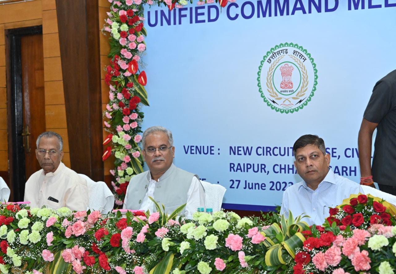 रायपुर मुख्यमंत्री श्री भूपेश बघेल की अध्यक्षता में आज यहां न्यू सर्किट हाउस के सभाकक्ष में यूनीफाईड कमांड की बैठक आयोजित की गई। बैठक में मुख्यमंत्री ने कहा कि छत्तीसगढ़ राज्य में नक्सल गतिविधियों में निरन्तर कमी आ रही है। राज्य में केन्द्रीय सुरक्षाबलों और छत्तीसगढ़ पुलिस द्वारा बेहतर तालमेल के साथ नक्सलियों के विरूद्ध सफलतापूर्वक चलाये जा रहे संयुक्त अभियान के कारण यह संभव हो सका है। संवेदनशील क्षेत्रों में नक्सलियों के विरूद्ध चलाये जा रहे सघन अभियान के साथ विकास कार्यों में भी तेजी लायी जा रही है जिससे आम जनता का शासन व प्रशासन के प्रति विश्वास बढ़ा है।
