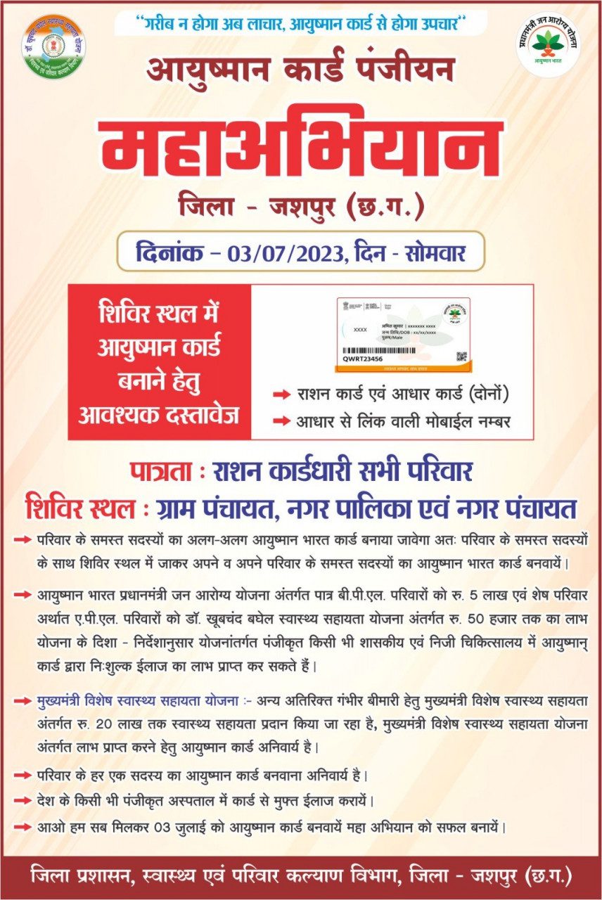 जशपुरनगर  जिला प्रशासन एवं स्वास्थ्य एवं परिवार कल्याण विभाग के द्वारा आयुष्मान कार्ड पंजीयन महाअभियान 03 जुलाई 2023 को जिले के सभी विकासखंड के ग्राम पंचायत, नगर पालिका एवं नगर पंचायत में आयोजित किया जा रहा है। गरीब न होगा अब लाचार, आयुष्मान कार्ड से होगा उपचार संकल्प के साथ स्वास्थ्य विभाग द्वारा महाअभियान में शत प्रतिशत आयुष्मान कार्ड जारी करने के उद्देश्य से हितग्राहियों को शिविर स्थल में राशन कार्ड एवं आधार कार्ड, आधार से लिंक वाली मोबाईल नम्बर के साथ उपस्थित होने का आग्रह किया गया है। आयुष्मान कार्ड के लिए राशन कार्ड धारक सभी परिवार पात्र होगें।