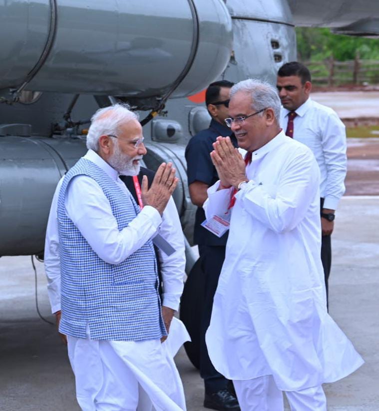 Home » प्रधानमंत्री नरेंद्र मोदी मुख्यमंत्री भूपेश बघेल ने पुष्प गुच्छ भेंट कर उनका छत्तीसगढ़ में आत्मीय स्वागत किया