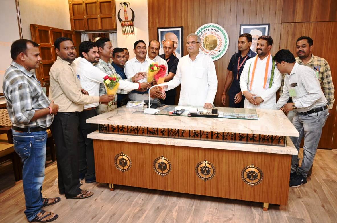 रायपुर । मुख्यमंत्री श्री भूपेश बघेल से आज विधानसभा परिसर स्थित उनके कार्यालय कक्ष में प्रदेश पंचायत सचिव संघ छत्तीसगढ़ के प्रतिनिधि मंडल ने मुलाकात की। मुख्यमंत्री श्री बघेल को प्रतिनिधि मंडल ने पंचायत सचिवों को विशेष भत्ता दिए जाने पर मिठाई खिलाकर धन्यवाद दिया। उन्होंने बताया कि प्रदेशभर के पंचायत सचिवों में कल की गई घोषणा से हर्ष की लहर है। पंचायत सचिवों के हित में लिया गया फैसला ऐतिहासिक है। उल्लेखनीय है कि अनुपूरक बजट में पंचायत सचिवों के वेतन में वृद्धि की गई है।