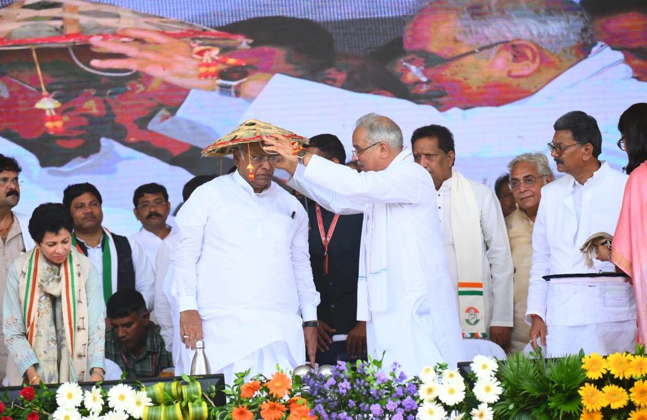 मुख्य मंच पर श्री खड़गे का गजमाला सहित जांजगीर-चांपा की प्रसिद्ध कोसा शाल और खुमरी पहनाकर मुख्यमंत्री श्री भूपेश बघेल छत्तीसगढ़ विधानसभा अध्यक्ष डॉ. चरण दास महंत, पूर्व केंद्रीय मंत्री सुश्री कुमारी शैलजा, राज्य के उपमुख्यमंत्री श्री टी. एस. सिंहदेव, सांसद श्री दीपक बैज सहित अतिथियों ने स्वागत किया। इस अवसर पर छत्तीसगढ़ शासन के मंत्रीगण और बड़ी संख्या में जनप्रतिनिधि और नागरिकगण उपस्थित थे। इसके पहले मुख्यमंत्री श्री भूपेश बघेल ने राजधानी रायपुर के एयरपोर्ट में श्री खड़गे की अगवानी की और हेलीकॉप्टर में उन्हें लेकर जांजगीर पहुंचे। खोखरा पहुंचने पर मुख्य अतिथि श्री खड़गे और अध्यक्ष मुख्यमंत्री श्री भूपेश बघेल सहित विशिष्ट अतिथियों का कर्मा नृत्य और झांझ मंजीरे के साथ आत्मीय स्वागत किया गया।