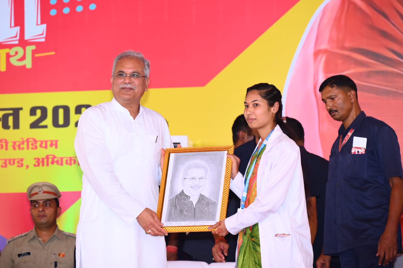 सरगुजा के मान बढ़ाबो मांदर के ताल म – मुख्यमंत्री के स्वागत के लिए हॉकी स्टेडियम युवाओं से खचाखच भरा था। युवाओं ने छत्तीसगढ़ी और सरगुजिहा गीतों से अपनी प्रस्तुति दी। हाय डारा लोर गे हे जैसे गीतों की प्रस्तुति में युवा खूब झुमे। सरगुजा के मान बढ़ाबो मांदर के ताल म। जैसे गीतों की प्रस्तुति ने भी युवाओं को मंत्रमुग्ध कर दिया। छत्तीसगढ़िया ओलंपिक खेलों के शुभंकर बछरू ने भी युवाओं का उत्साह बढ़ाया।