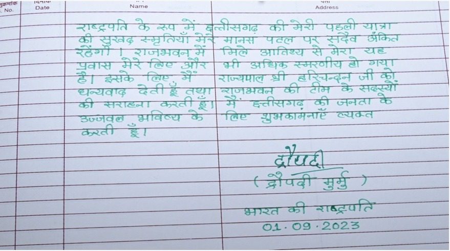 रायपुर राष्ट्रपति श्रीमती द्रौपदी मुर्मु ने अपने छत्तीसगढ़ प्रवास को सुखद बताया, राजभवन में मिले आतिथ्य को अत्यन्त सराहा और छत्तीसगढ़ की जनता को शुभकामनाएं दीं। श्रीमती मुर्मु ने आज यहां राजभवन से प्रस्थान के पूर्व यहां के विजिटर बुक में अपनी भावनाओं को शब्द दिए। विजिटर बुक में उनके द्वारा लिखित पाठ इस प्रकार है-