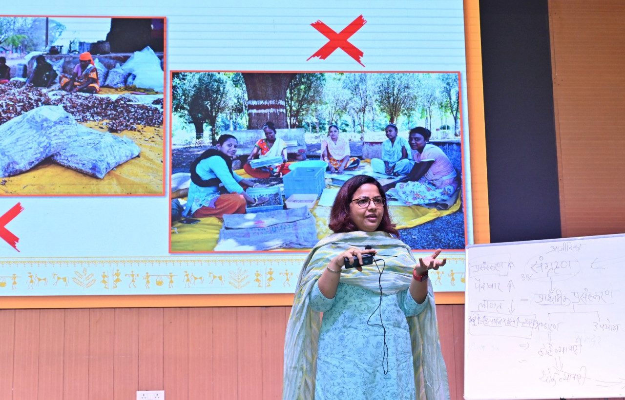 फाउन्डेशन फॉर इकोलॉजिकल सिक्योरिटी की संचालक सुश्री मंजीत कौर द्वारा आपूर्ति की श्रृंखला को विस्तार से समझाते हुए बताया कि कैसे संग्रहणकर्ता उत्पाद की कीमत को बढ़ा सकते हैं। छत्तीसगढ़ राज्य लघु वनोपज संघ के श्री भरत राजपुरोहित ने वनोपज के भण्डारण, भण्डारण का समय, भण्डारण में अपनाई जाने वाली सावधानियों के बारे में बताया। उन्होंने छत्तीसगढ़ राज्य लघु वनोपज संघ द्वारा निर्धारित मापदंड की जानकारी भी दी।