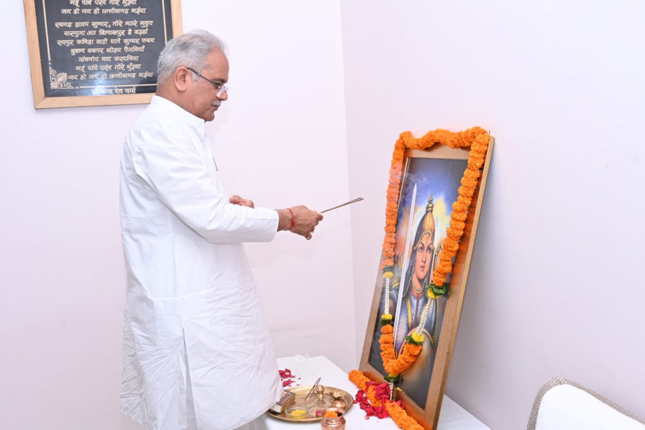 रायपुर मुख्यमंत्री श्री भूपेश बघेल ने आज यहाँ अपने निवास कार्यालय में वीरांगना रानी दुर्गावती की जयंती पर उनके चित्र पर पुष्प अर्पित कर उन्हें नमन किया।