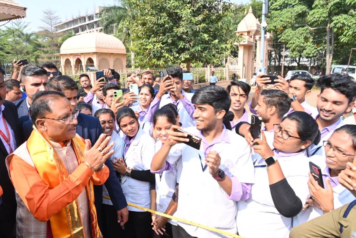रायपुर । मुख्यमंत्री श्री विष्णु देव साय आज जब वीआईपी रोड स्थित राम मंदिर पहुंचे तब नर्सिंग कॉलेज के कुछ युवा भी मंदिर दर्शन के लिए आए थे। मुख्यमंत्री को देखते ही युवाओं ने उन्हें जोर शोर से बधाई दी। उन्होंने युवाओं को धन्यवाद दिया। मुख्यमंत्री ने कहा कि हमें छत्तीसगढ़ के विकास की अहम जिम्मेदारी मिली है। आज इसकी शुभ शुरुआत मंदिर दर्शन से की है और आप सभी ऊर्जा से भरे हुए युवाओं का साथ मिला है। यह मेरे लिए बहुत खुशी की बात है। विकसित छत्तीसगढ़ बनाने के लिए आप सभी युवाओं का सहयोग जरूरी है।