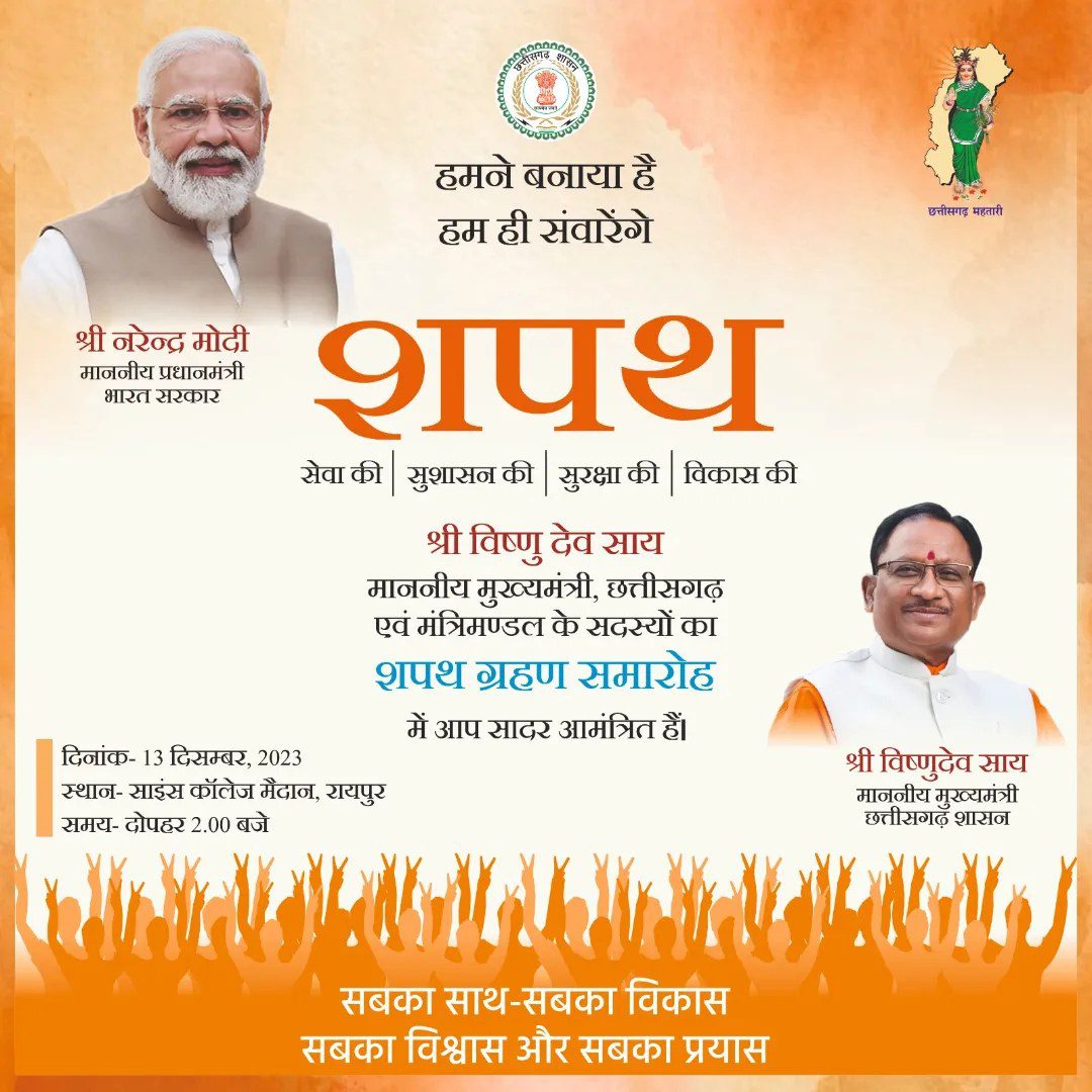 - रायपुर के साइंस कालेज मैदान में बुधवार को प्रधानमंत्री नरेन्द्र मोदी की मौजूदगी में मुख्यमंत्री विष्णुदेव साय मुख्यमंत्री पद की शपथ लेंगे।